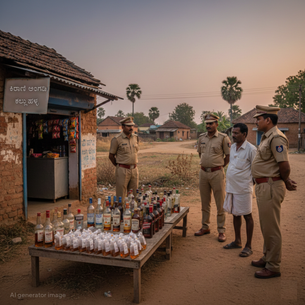 ಎಫ್ಐಆರ್ ವಿವರಗಳ ಪ್ರಕಾರ, ಫೆಬ್ರವರಿ 17ರಂದು ಸಂಜೆ 6.00 ಗಂಟೆ ವೇಳೆಗೆ ಖಚಿತ ಮಾಹಿತಿ ಪಡೆದ ಪೊಲೀಸರು ಕಲ್ಲು ಹಳ್ಳ ಗ್ರಾಮದ ಅಂಗಡಿ ಮುಂಗಟ್ಟು ಪ್ರದೇಶದ ಬಳಿ ದಾಳಿ ನಡೆದಿದೆ. ಈ ವೇಳೆ ಯಾವುದೇ ಮಾನ್ಯ ಪರವಾನಗಿ ಇಲ್ಲದೆ ಸಾರ್ವಜನಿಕರಿಗೆ ಮದ್ಯ ಮಾರಾಟ ಮಾಡುವ ಆರೋಪಿಯನ್ನು ವಶಕ್ಕೆ ತೆಗೆದುಕೊಳ್ಳಲಾಗಿದೆ.ಆರೋಪಿಯ ಬಳಿ ಸುಮಾರು 90 ಎಂಎಲ್ ಸಾಮರ್ಥ್ಯದ “ಒರಿಜಿನಲ್ ಚಾಯ್ಸ್ ಡಿಲಕ್ಸ್ ವಿಸ್ಕಿ” ಸೇರಿದಂತೆ ಮದ್ಯದ ಪ್ಯಾಕೆಟ್ಗಳು ಮತ್ತು ಬಾಟಲಿಗಳನ್ನು ಜಪ್ತಿ ಮಾಡಲಾಗಿದೆ. ಜಪ್ತಿ ಮಾಡಿದ ಮದ್ಯದ ಒಟ್ಟು ಮೌಲ್ಯ ಸುಮಾರು 600 ರೂಪಾಯಿಗಳಷ್ಟಿದೆ ಎಂದು ಎಫ್ಐಆರ್ನಲ್ಲಿ ಉಲ್ಲೇಖಿಸಲಾಗಿದೆ.